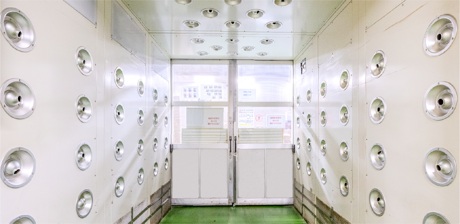 場内に入る前に全員が、粘着ローラー、石鹸での手洗い、アルコール除菌、エアシャワー通過を行うことで、異物混入を防ぎ、いつも清潔な作業現場となるよう心掛けています。