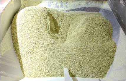 計量器で一袋あたりのグラム数を量ると、真下にある包装機に直接製品が入る仕組みになっています。