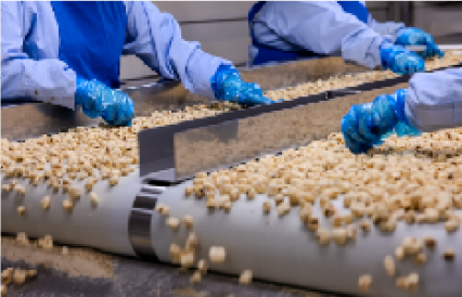 原材料をきちんと計量して味付けを行い、包装される前に、形状、味、色、香りをチェックしています。